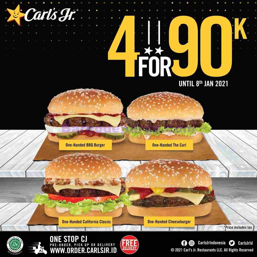 Harga Promo Carls Jr 4 Burger Hanya 90 Ribu Periode 1 8 Januari 2021 Barcodeharga Harga Promo Alfamart Indomaret Giant Hypermart Superindo Lottemart Carrefour - Known for their burgers and sandwiches, the fast food restaurant chain also has their own specialties, like the famous star and their six dollar burgers, and they're also one of the top fast.